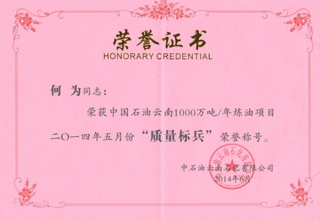 表彰:云南項(xiàng)目部何為同志榮獲中國(guó)石油云南1000萬噸/年煉油項(xiàng)目2014年5月份“質(zhì)量標(biāo)兵“榮譽(yù)稱號(hào)
