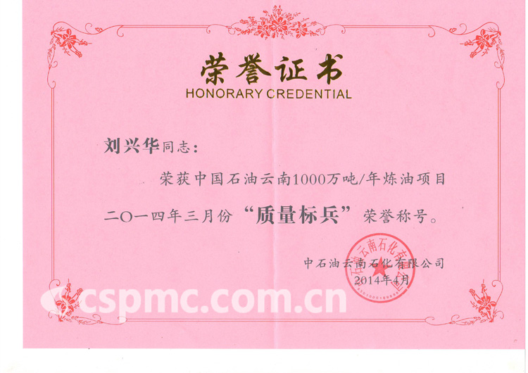 劉興華同志榮獲中國石油云南1000萬噸/年煉油項目2014年3月份“質(zhì)量標(biāo)兵”榮譽(yù)稱號